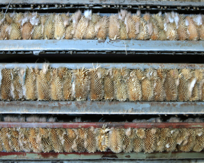Lo staff dell’azienda biellese inserisce manualmente i cardi vegetali negli apposti supporti, detti ferri: per ottenere una struttura compatta, vengono posti in parallelo e orientati nella stessa direzione.
